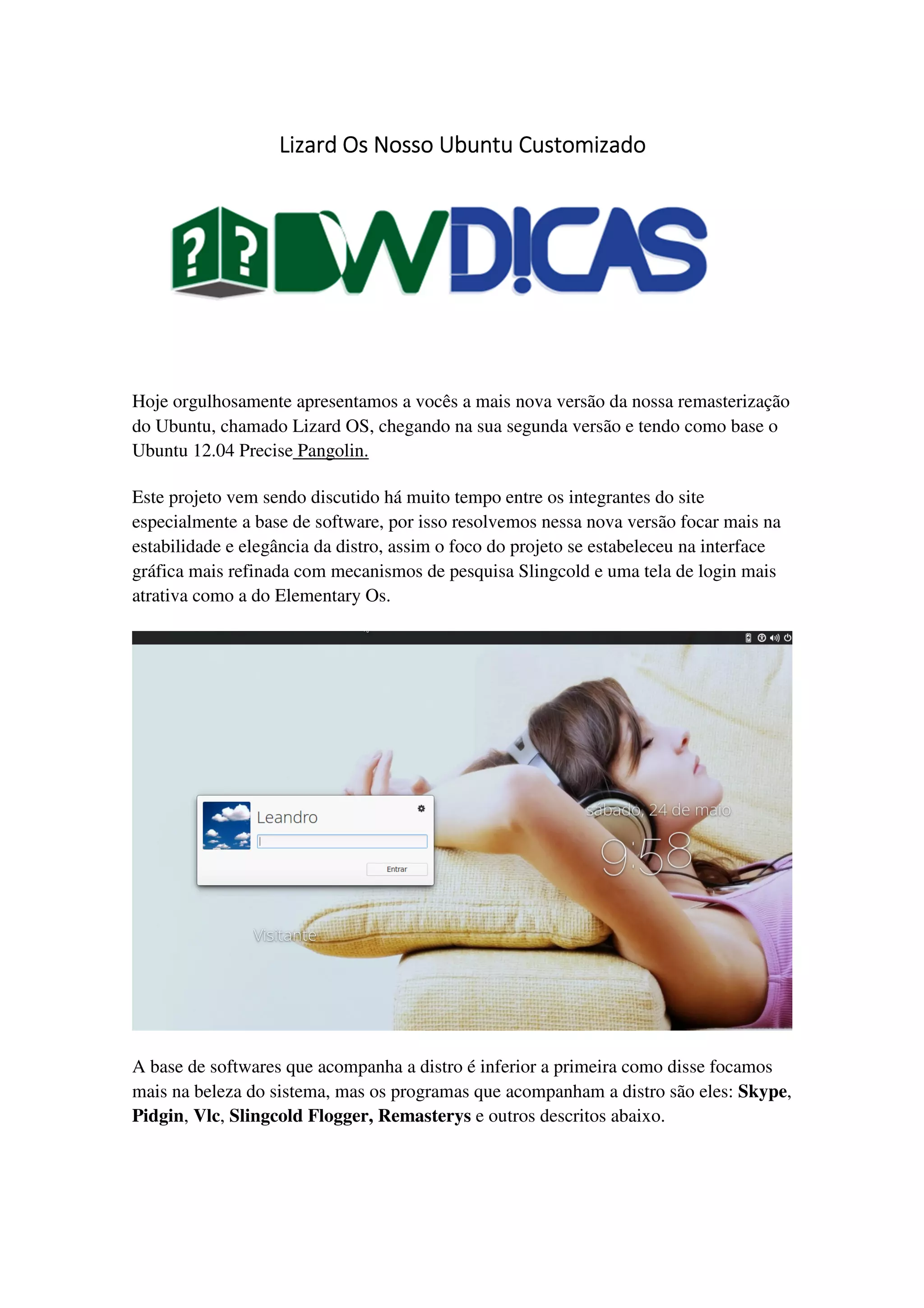 O documento apresenta a nova versão do Lizard OS, uma remasterização baseada no Ubuntu 12.04, focada na estabilidade e elegância da interface gráfica. Inclui uma seleção de aplicativos personalizados como Skype, VLC e GIMP, além de recursos de otimização e atalhos. Embora inicialmente planejado para ser baseado no Elementary OS, o projeto continuou com o Ubuntu 12.04 devido a bugs encontrados durante os testes.