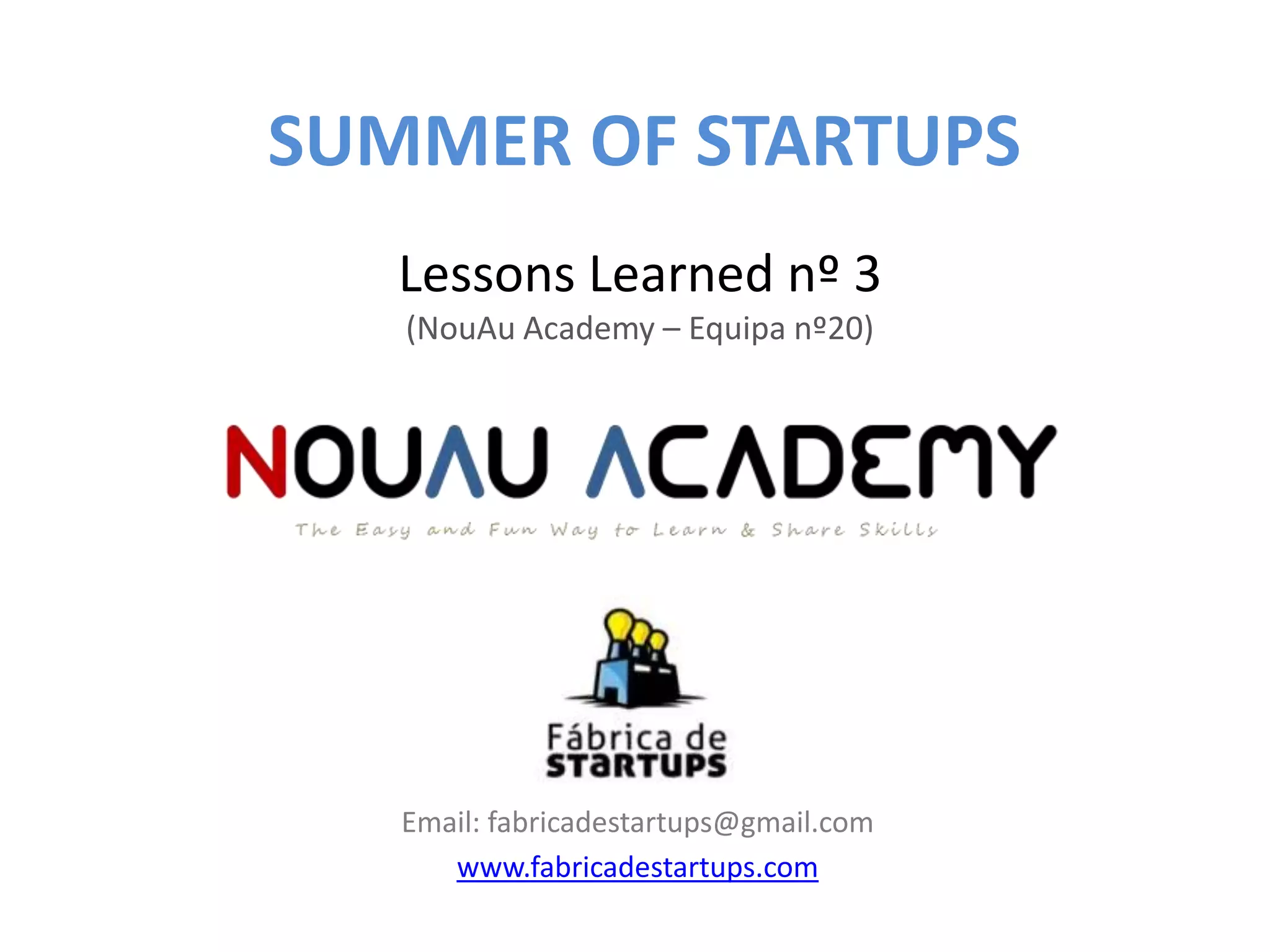 Este documento resume o trabalho desenvolvido pela Equipa 20 do programa Summer of Startups da NouAu Academy. A equipa atualizou o seu blog, testou hipóteses sobre o negócio, calculou métricas como CAC e VVC, realizou sondagens, e criou uma página inicial para testar a proposta de valor. Nas próximas semanas, a equipa irá lançar anúncios no Google e Facebook, testar o produto mínimo viável, e validar o modelo de negócio com base nos resultados dos testes.