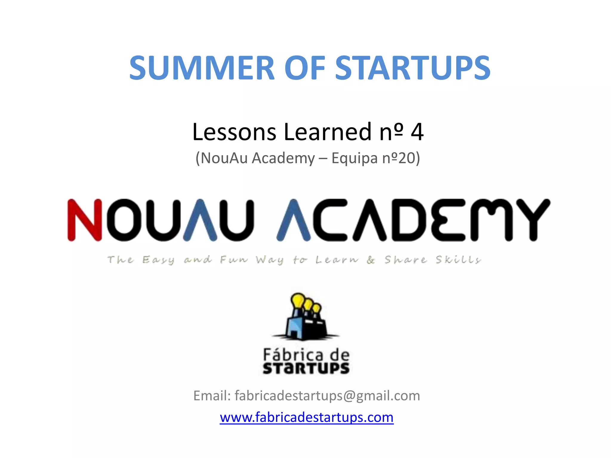 Este documento resume o trabalho desenvolvido pela Equipa 20 da NouAu Academy no seu 4o relatório do programa Summer of Startups. Nele, a equipa define um produto mínimo viável para testar, analisa respostas a questionários, identifica parceiros e fontes de receita, e elabora um plano financeiro inicial para a sua ideia de negócio de oferecer workshops criativos.