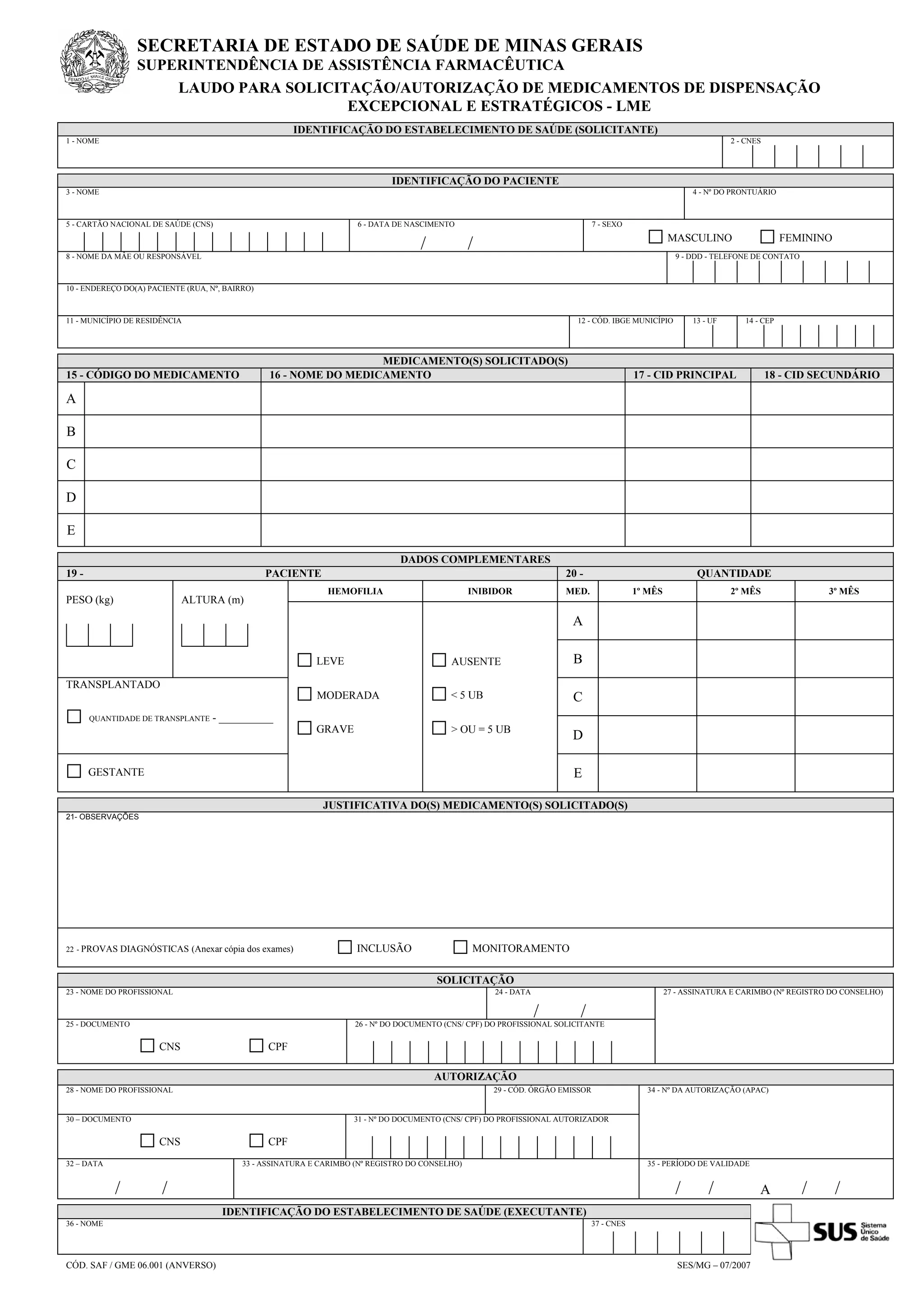 Este documento é um laudo médico para solicitação de medicamentos de dispensação excepcional e estratégicos. Contém informações de identificação do paciente e do estabelecimento de saúde solicitante, dados clínicos do paciente, medicamentos solicitados com seus códigos e justificativa, além de áreas para assinatura do médico solicitante e autorizador.