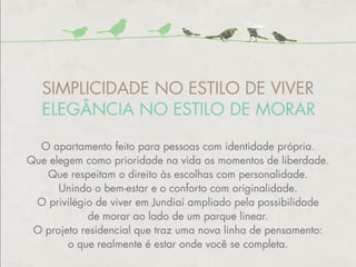 O documento apresenta um projeto de um condomínio localizado em Jundiaí com investimentos significativos na cidade, incluindo a implantação de um parque linear. O projeto contém 215 unidades residenciais de diferentes tamanhos, além de diversas áreas de lazer e infraestrutura para um estilo de vida moderno e sustentável. Estão previstas áreas verdes, socialmente equipadas e acessíveis, com foco em eficiência e conforto para os moradores.