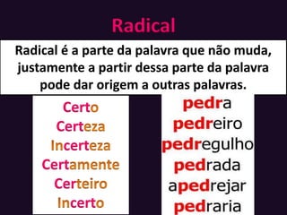 O documento explica conceitos fundamentais da língua portuguesa, como: (1) radicais, que são partes das palavras que não mudam e dão origem a outras palavras; (2) justaposição e aglutinação, que são formas de combinar palavras; e (3) palavras primitivas e derivadas, sendo as primeiras origens de outras palavras e as segundas formadas a partir das originais.