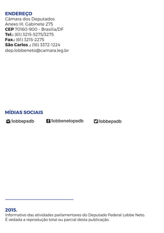 - O documento apresenta as proposições legislativas e atuações parlamentares de Lobbe Neto em 2015, incluindo projetos de lei, moções, requerimentos e relatorias.