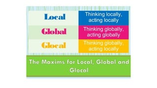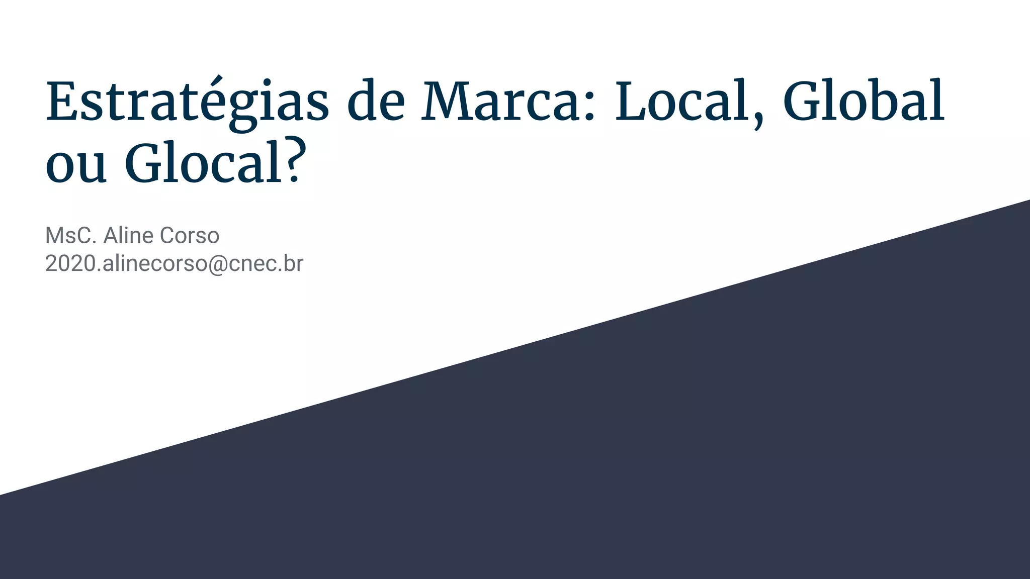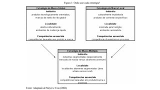 O documento discute as estratégias de marca local, global e glocal. A estratégia de marca local envolve o desenvolvimento de marcas para mercados específicos, valorizando a identidade cultural local. A estratégia de marca global envolve a padronização da marca e sua oferta em diversos mercados. A estratégia glocal combina elementos globais e locais, reconhecendo diferenças culturais locais.