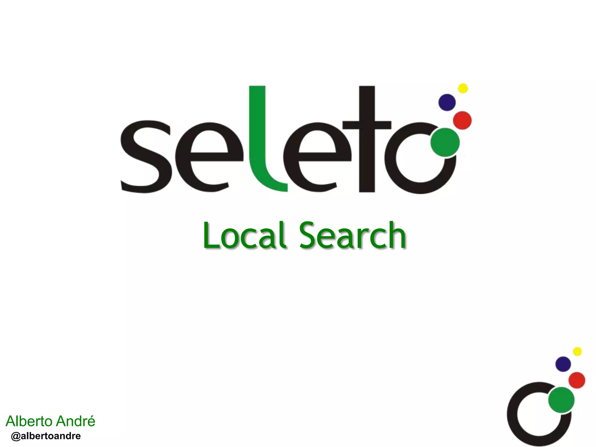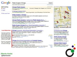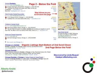O documento aborda a importância e estratégias de otimização para a busca local, destacando a superioridade das taxas de conversão em comparação aos links patrocinados. Inclui dicas sobre como evitar erros no Google Places, como o uso consistente de números de telefone e endereços, além de técnicas para otimizar listagens e monitorar resultados. Recomenda ainda a utilização de URL de monitoramento e segmentação no Google Analytics para acompanhar o desempenho da busca local.