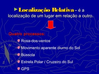 O documento discute quatro processos para determinar a localização relativa de lugares: 1) rosa-dos-ventos, 2) movimento aparente do sol, 3) bússola, e 4) estrelas como a Estrela Polar e o Cruzeiro do Sul. Também menciona o GPS como uma opção moderna.