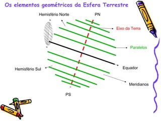 O documento descreve os principais elementos geométricos da Terra, incluindo o eixo, equador, hemisférios, paralelos e meridianos. Explica que a latitude é a distância angular em relação ao equador, variando de 0° a 90° Norte ou Sul, enquanto a longitude é a distância angular em relação ao meridiano de Greenwich, variando de 0° a 180° Leste ou Oeste.