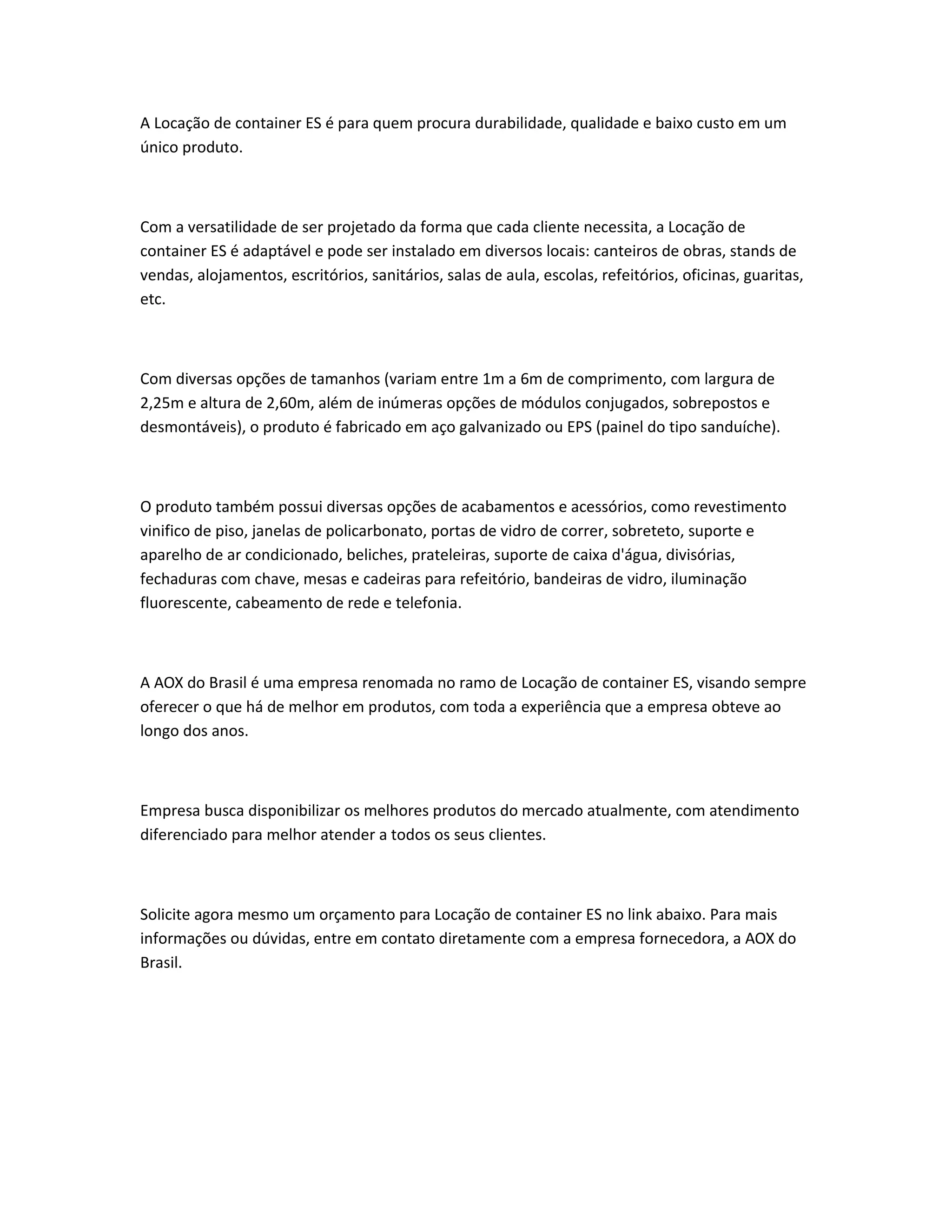 A locação de containers ES oferece durabilidade, qualidade e baixo custo, adaptando-se às necessidades dos clientes em diversos ambientes, como canteiros de obras e salas de aula. Disponíveis em tamanhos variados e com múltiplos acabamentos e acessórios, são fabricados em aço galvanizado ou EPS. A Aox do Brasil é a fornecedora renomada que busca oferecer produtos de alta qualidade com um atendimento diferenciado.
