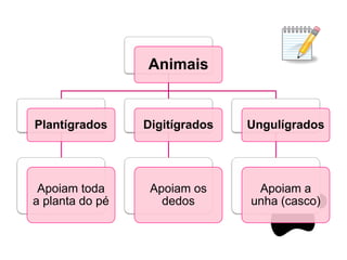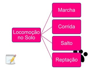 A locomoção é o modo como os animais se deslocam para capturar alimentos, fugir de predadores ou encontrar condições de vida melhores. Existem diferentes modos de locomoção no solo como a marcha, corrida e salto, que dependem da estrutura dos membros e da área de apoio no chão. A velocidade varia de acordo com o número de dedos ou patas em contato com o solo.