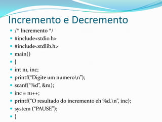 O documento apresenta exemplos de códigos em C sobre incremento, decremento, operadores relacionais e lógicos. Também fornece exercícios para praticar esses conceitos envolvendo estruturas de decisão como if/else e comparações.