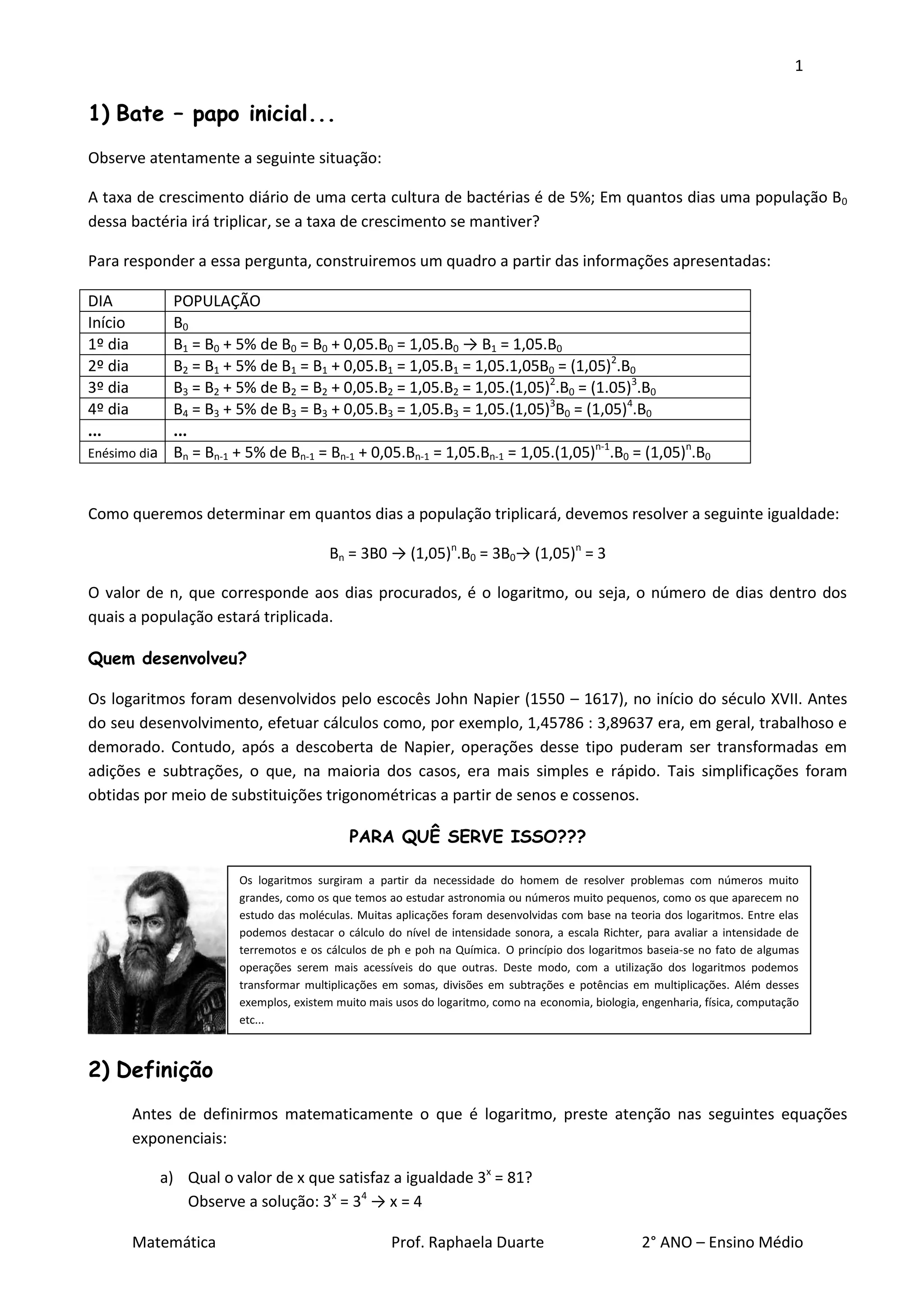 O documento discute logaritmos, definindo-os como o expoente a que devemos elevar uma base para obter um número. Apresenta propriedades dos logaritmos e exemplos de suas aplicações em áreas como química e engenharia.