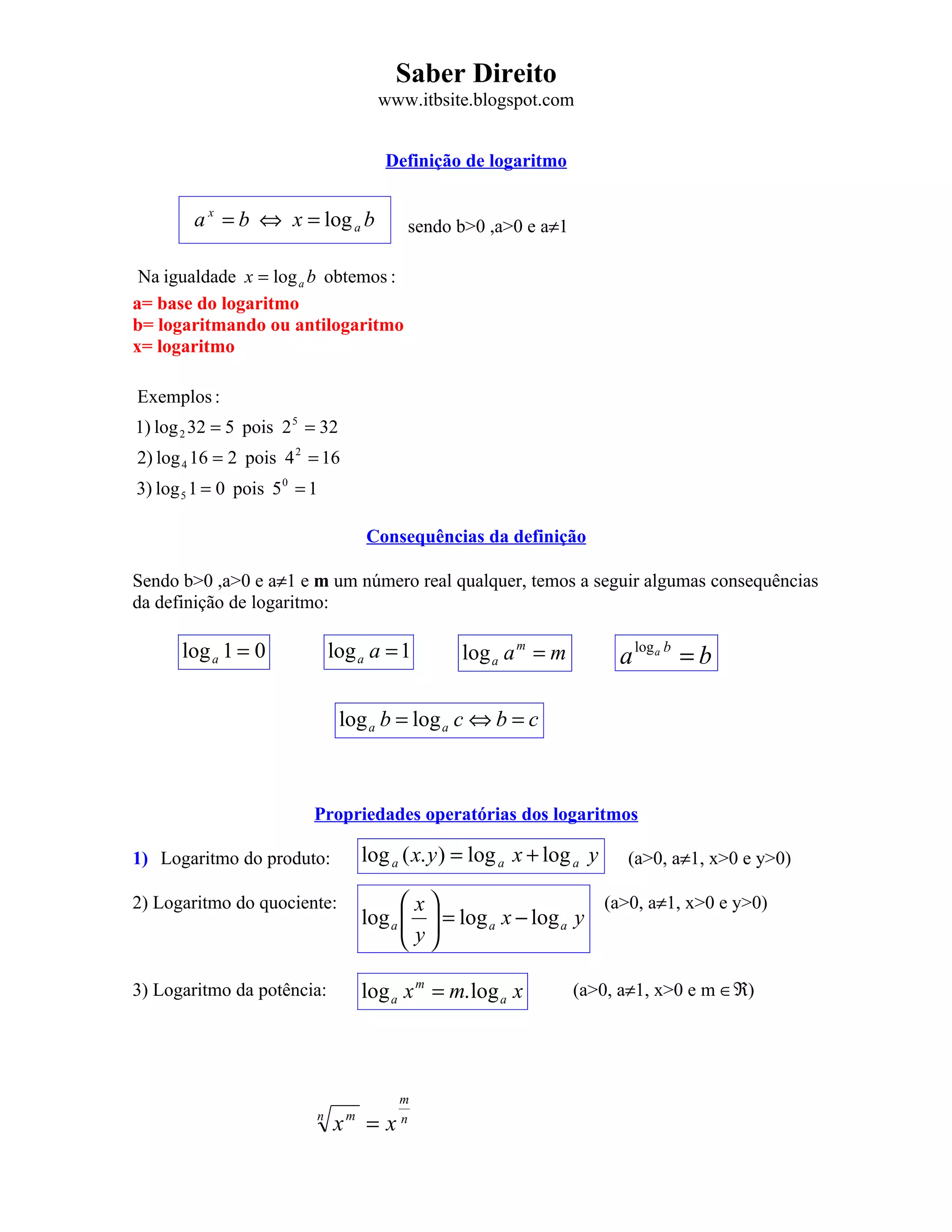 O documento define logaritmos e apresenta suas propriedades fundamentais: 1) Logaritmos mapeiam multiplicação para adição; 2) As propriedades incluem logaritmos de produtos, quocientes e potências; 3) O cologaritmo é o inverso do logaritmo; 4) É possível mudar a base de um logaritmo usando a propriedade loga x = logb x / logb a.