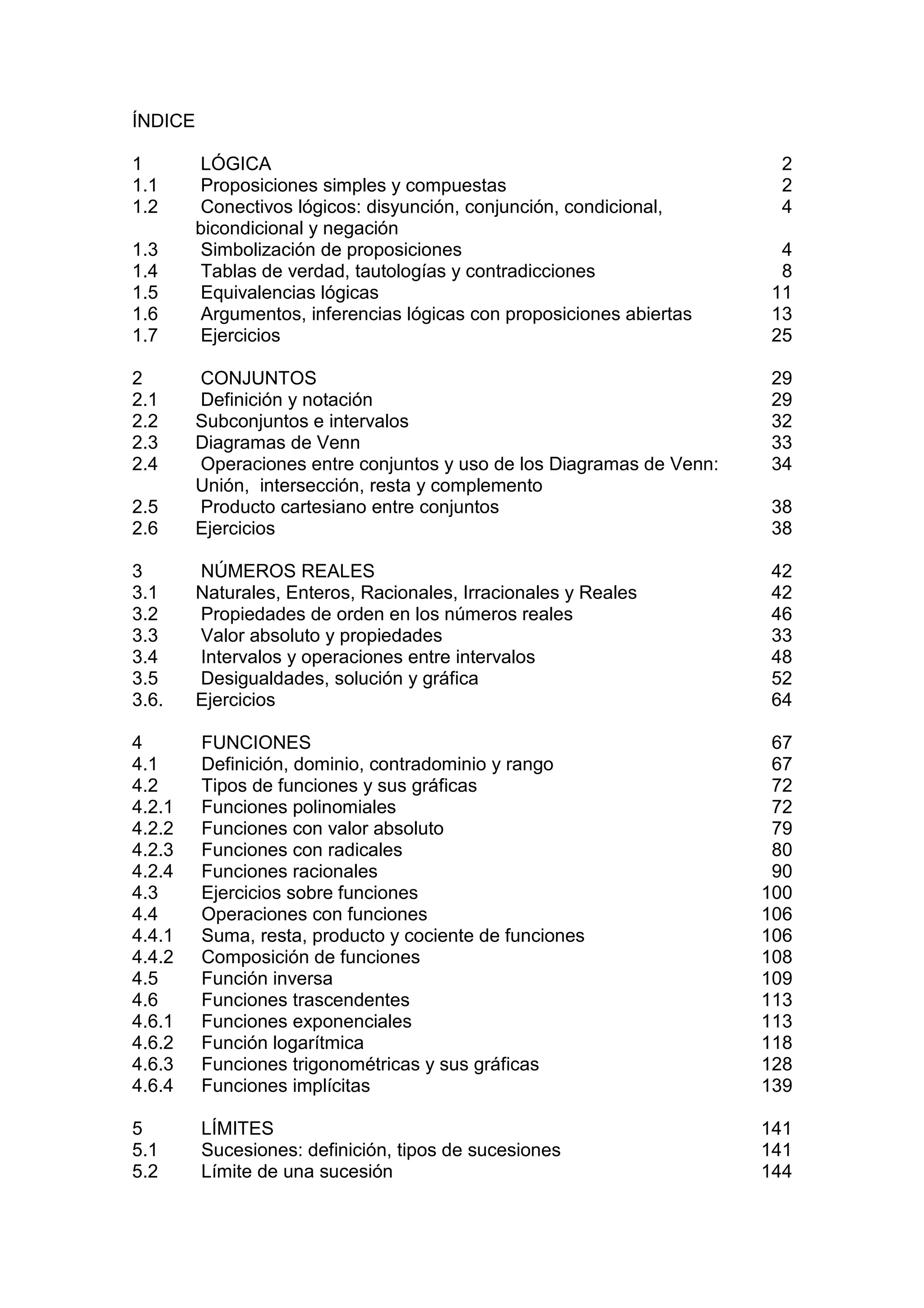 Este documento presenta un índice de los temas que se abordarán en el curso de Cálculo Diferencial. Incluye secciones sobre lógica, conjuntos, números reales, funciones, límites, continuidad, derivadas y aplicaciones de la derivada. Cada sección contiene una introducción al tema, definiciones y conceptos teóricos clave, ejemplos y ejercicios para que los estudiantes apliquen los conocimientos.