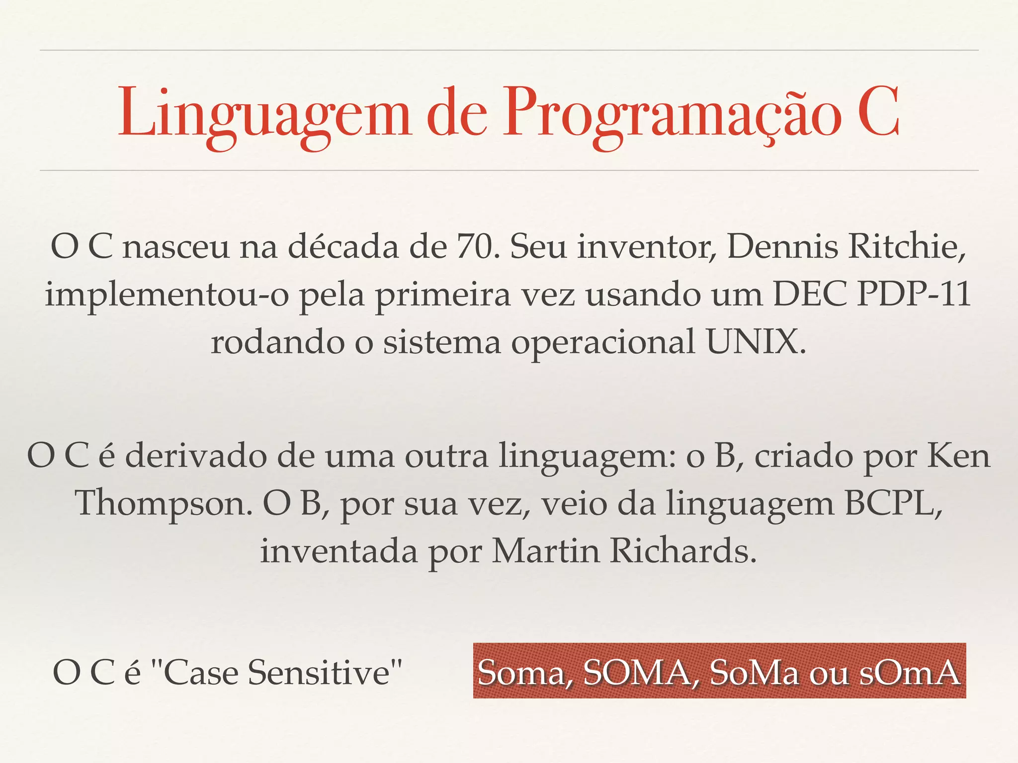 A linguagem de programação C, criada por Dennis Ritchie na década de 70, é amplamente utilizada em diversos sistemas, incluindo Microsoft Windows e aplicações gráficas. O documento explica aspectos básicos da linguagem, incluindo a sintaxe, tipos de dados e bibliotecas como stdio.h e stdlib.h. Além disso, aborda o processo de desenvolvimento de programas em C, que envolve escrita, compilação, linking e execução.