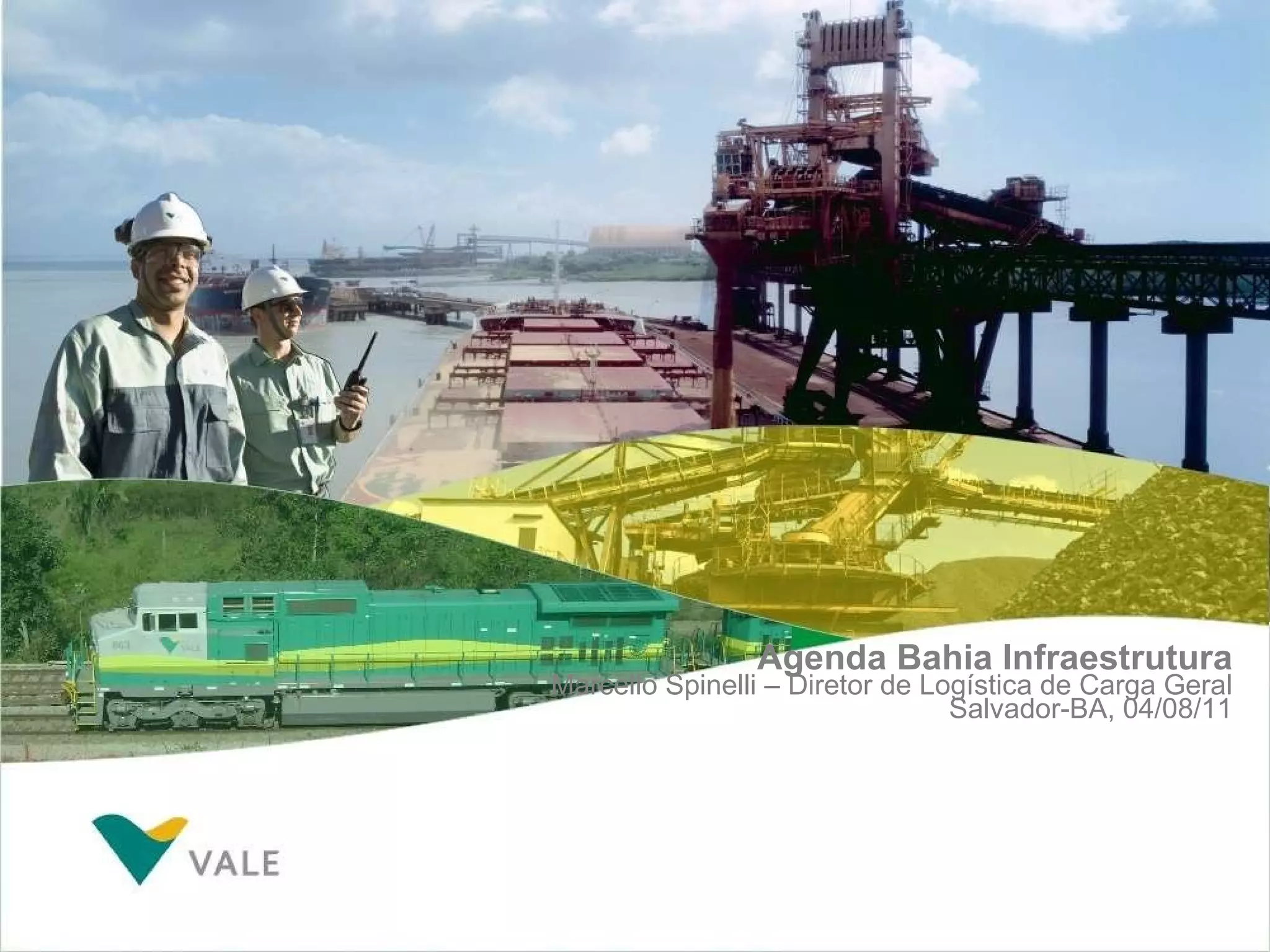 O documento discute a infraestrutura logística da Vale na Bahia. Apresenta os ativos da Vale na região, incluindo a Ferrovia Centro-Atlântica, e destaca oportunidades para melhorar a integração entre ferrovias, portos e terminais para apoiar o crescimento econômico do estado.