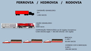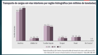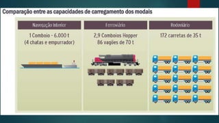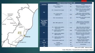 O documento discute os diferentes modais de transporte e classificações de transporte quanto à forma. Apresenta detalhes sobre o transporte rodoviário, incluindo veículos, documentação requerida para transporte de cargas perigosas, e legislação sobre transporte rodoviário de cargas.