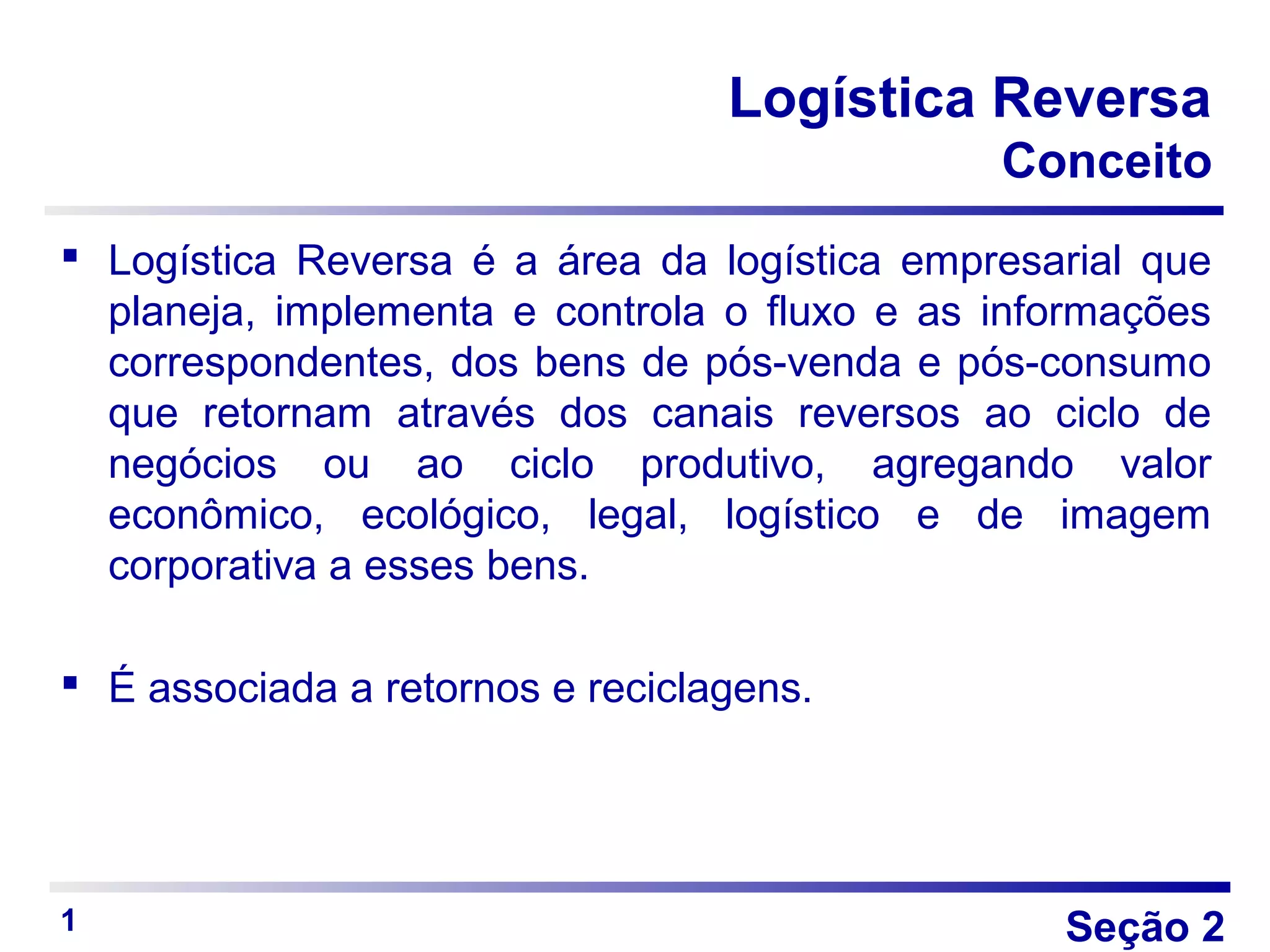 Este documento discute logística reversa e o profissional de logística. Apresenta conceitos de logística reversa e características do Brasil. Fornece exemplos de empresas que implementaram logística reversa com sucesso. Discute fluxos diretos e reversos na cadeia de suprimentos e as amplas atividades de um profissional de logística.