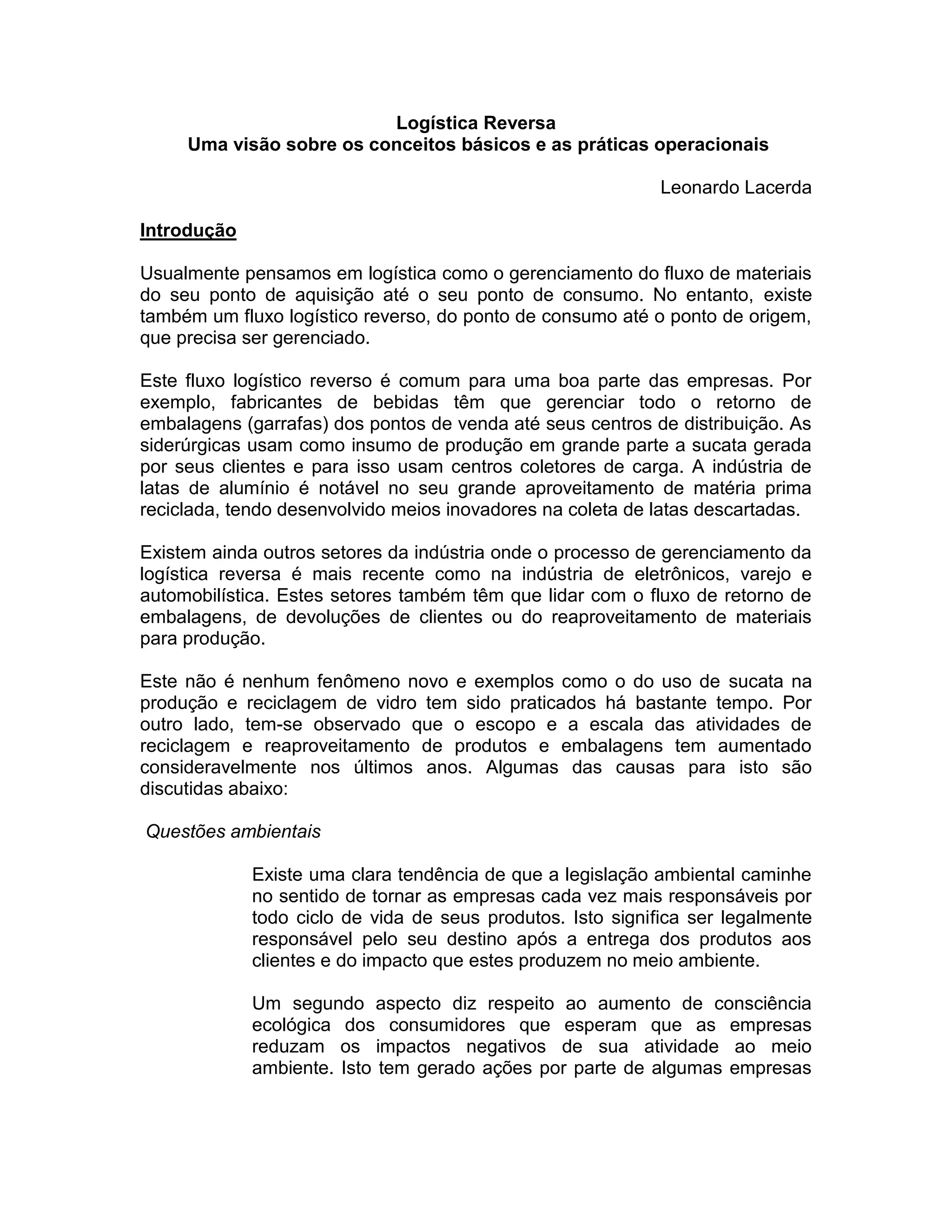 1) O documento discute os conceitos e práticas da logística reversa, que envolve o gerenciamento do fluxo de materiais do ponto de consumo de volta ao ponto de origem.