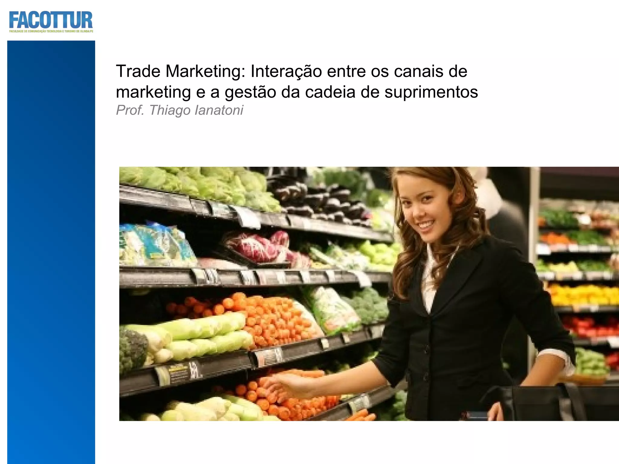 O documento discute os canais de marketing e como eles interagem com a gestão da cadeia de suprimentos. Apresenta os conceitos de canal de marketing, seleção e tipos de canais de distribuição, além de alternativas de organização dos canais, como sistemas verticais, horizontais e multicanais. Explora critérios para decisão sobre o número de intermediários em uma cadeia, como distribuição exclusiva, seletiva ou intensiva.