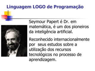 O documento descreve a linguagem de programação LOGO criada por Seymour Papert em 1960 para uso em ambientes computacionais interativos de aprendizagem. A abordagem construcionista da LOGO proporciona aos aprendizes um ambiente desafiador que estimula o pensamento ativo e a construção do conhecimento a partir de ações. A LOGO tem fundamentação psicopedagógica e pode representar conteúdos de todas as áreas.