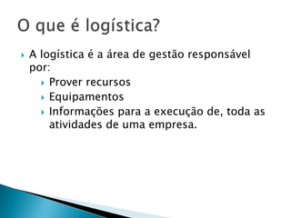 A logística é responsável por fornecer recursos, equipamentos e informações para executar as atividades de uma empresa. Ela envolve ciências humanas, administração, contabilidade, estatística, marketing, engenharia e transportes para armazenar, transportar, distribuir e monitorar produtos no tempo, lugar e custo corretos.