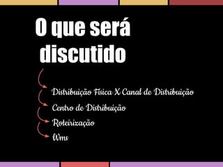 O documento discute conceitos básicos de logística, incluindo distribuição física versus canal de distribuição, centros de distribuição, roteirização e sistemas de gerenciamento de armazém (WMS). Centros de distribuição recebem, consolidam e fracionam cargas para envio a varejistas, e roteirização planeja rotas de transporte para minimizar distância ou tempo. WMS gerencia as operações diárias de armazéns.