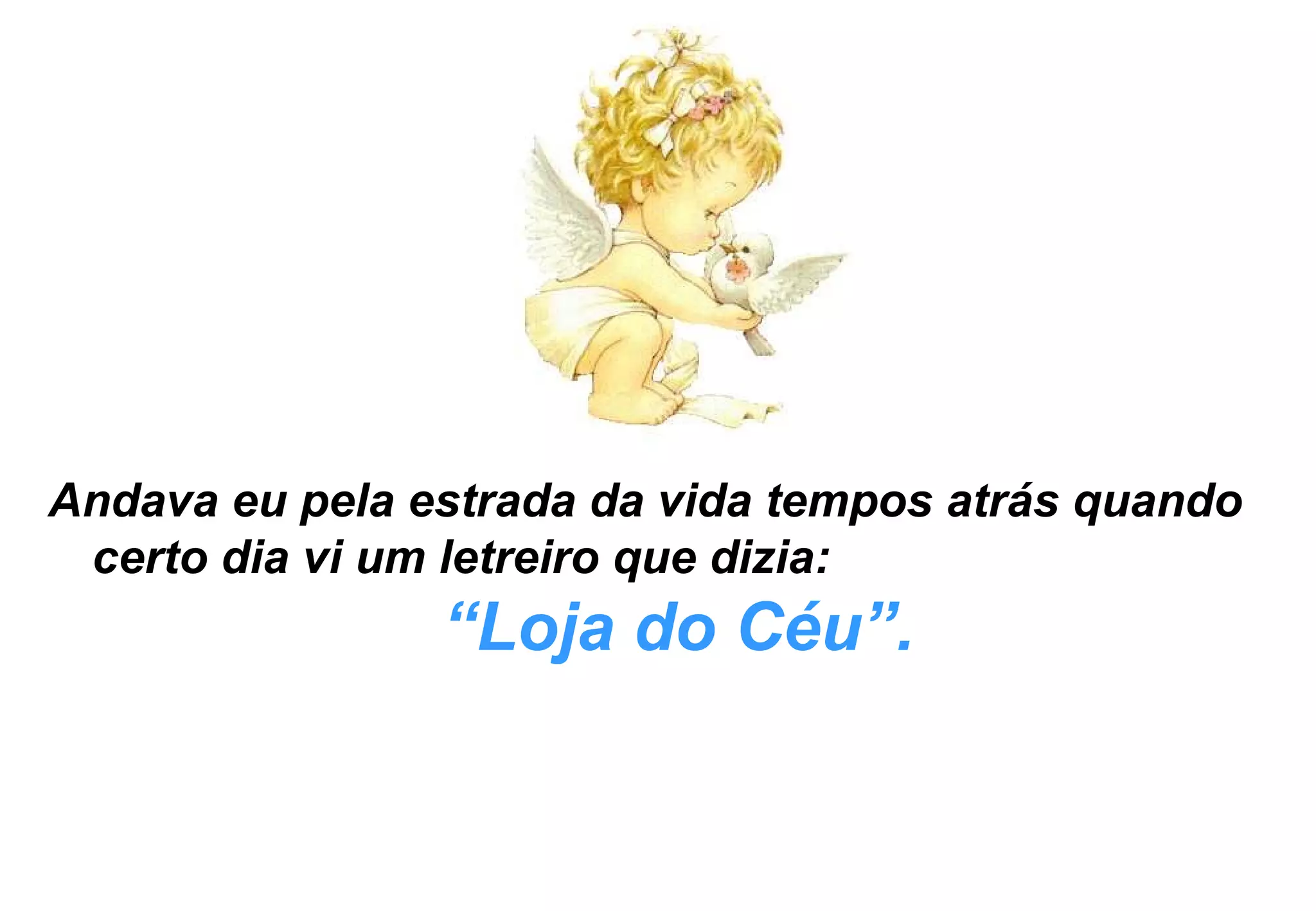 O documento descreve uma viagem de um homem a uma "Loja do Céu" onde ele compra várias virtudes cristãs como paciência, amor, compreensão, sabedoria, fé, espírito santo, força e coragem. Ao chegar ao caixa, ele descobre que Jesus já havia pago por tudo.