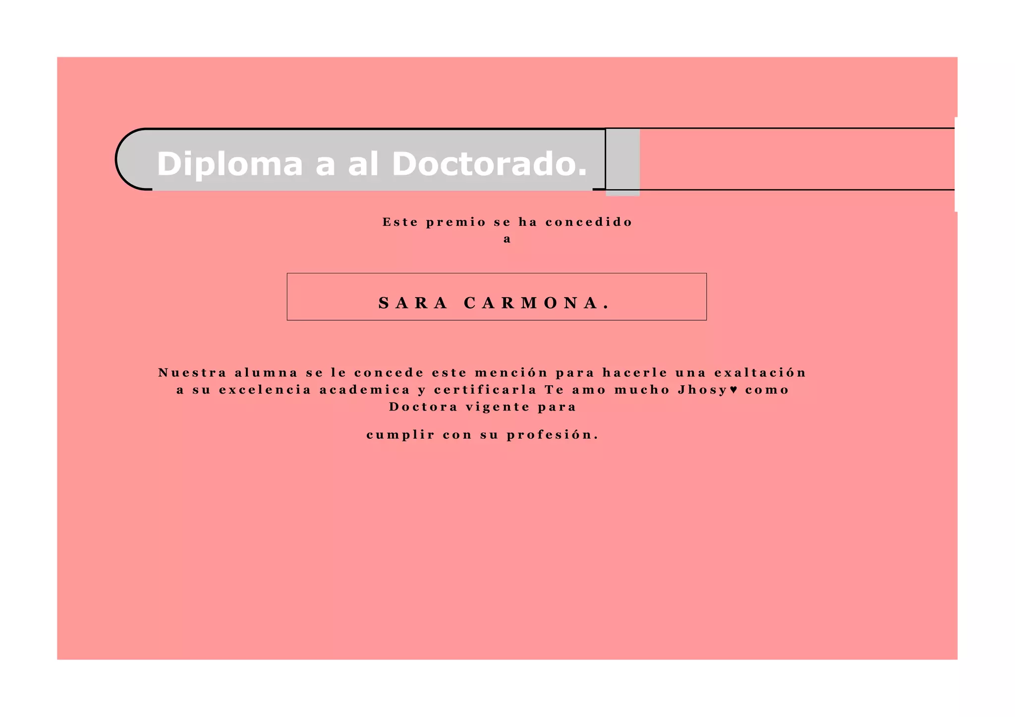 Este documento concede um diploma de doutorado para Sara Carmona. Nossa aluna recebe esta menção para exaltar sua excelência acadêmica e certificá-la como doutora vigente para exercer sua profissão.