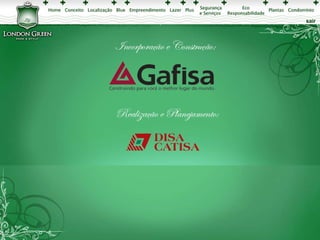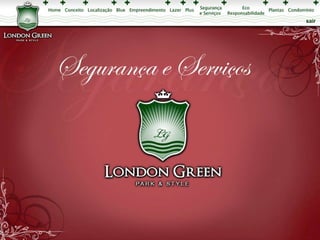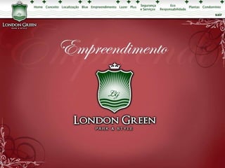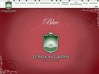 Este documento apresenta os detalhes de projeto de um empreendimento residencial chamado London Green, incluindo plantas baixas com a localização de seis blocos de apartamentos, perspectivas ilustrativas das áreas comuns e dos apartamentos, além de especificações sobre os tipos de unidades.