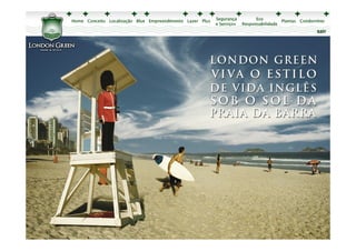 O documento apresenta imagens e detalhes de um empreendimento imobiliário chamado Blue Land, incluindo plantas baixas e perspectivas dos edifícios, áreas comuns e unidades residenciais. As imagens mostram diferentes tipos de apartamentos com 2, 3 ou 4 quartos, além de áreas de lazer como piscina, quadras, academia e salão de festas. O objetivo é promover as vendas deste empreendimento de alto padrão.