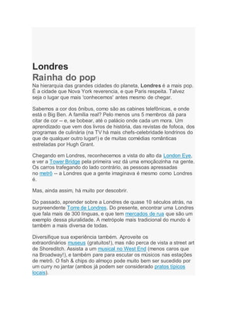 Londres é a cidade mais icônica do mundo, reverenciada por Nova York e respeitada por Paris, com uma rica cultura popular reconhecida globalmente. Oferece uma mistura de tradição e diversidade, apresentando dos históricos pontos turísticos a uma vibrante cena de rua e gastronômica. Além disso, eventos culturais, como musicais e exposições, refletem a constante evolução da cidade, que promete se manter na vanguarda da cultura pop.