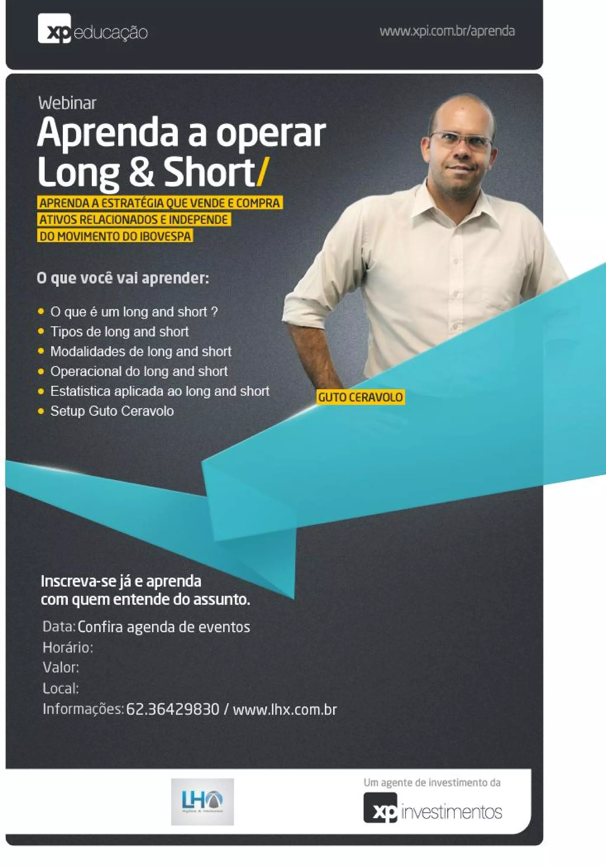 Webinar Aprenda a operar Long & Short/ Programação O que é um long and short Tipos de long and short Modalidades de long and short Operacional do long and short Estatística aplicada ao long and short Setup Guto Ceravolo Local: On line Carga Horária: 3 horas/aula + 1 hora/prática Valor: R$ 100,00