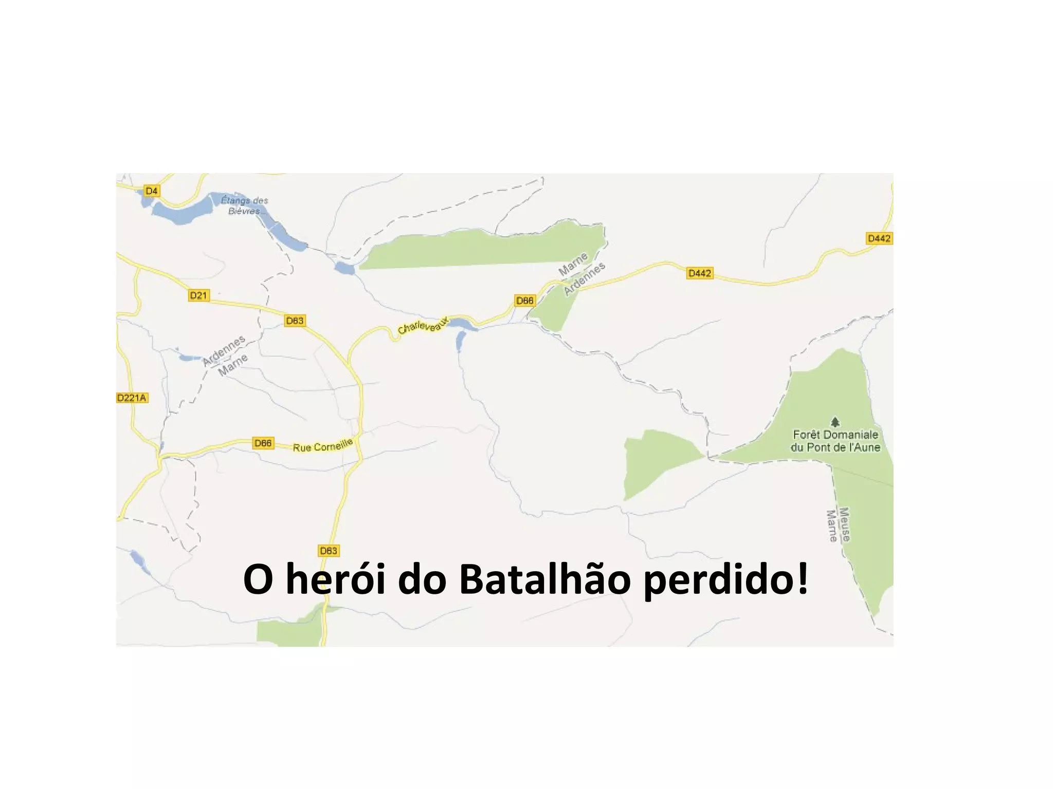 O documento descreve a história do "Batalhão Perdido" durante a Primeira Guerra Mundial, onde o 1o Batalhão dos EUA ficou isolado atrás das linhas inimigas. Seu último pombo-correio, Cher Ami, levou uma mensagem crucial pedindo para parar o bombardeio amigo, salvando muitas vidas. Apesar de ferimentos graves, Cher Ami conseguiu entregar a mensagem a tempo.