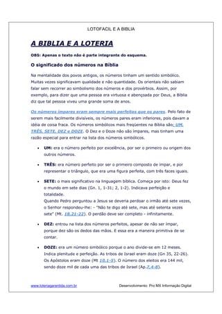 1) O documento discute a relação entre números bíblicos e a loteria, afirmando que números como 1, 3, 7, 10 e 12 tem significados simbólicos na Bíblia e podem ser usados para escolher números da lotofacil.