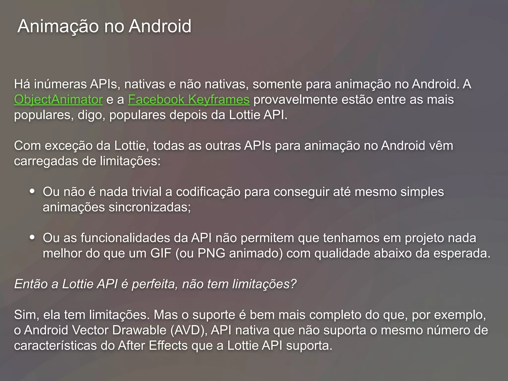 O documento discute a biblioteca Lottie API para animações no Android. A Lottie API permite animações mais completas importadas do After Effects e oferece menos limitações do que outras APIs de animação no Android. A biblioteca suporta animações locais, remotas e permite controle de progresso, frames, velocidade, repetições e cores das animações.
