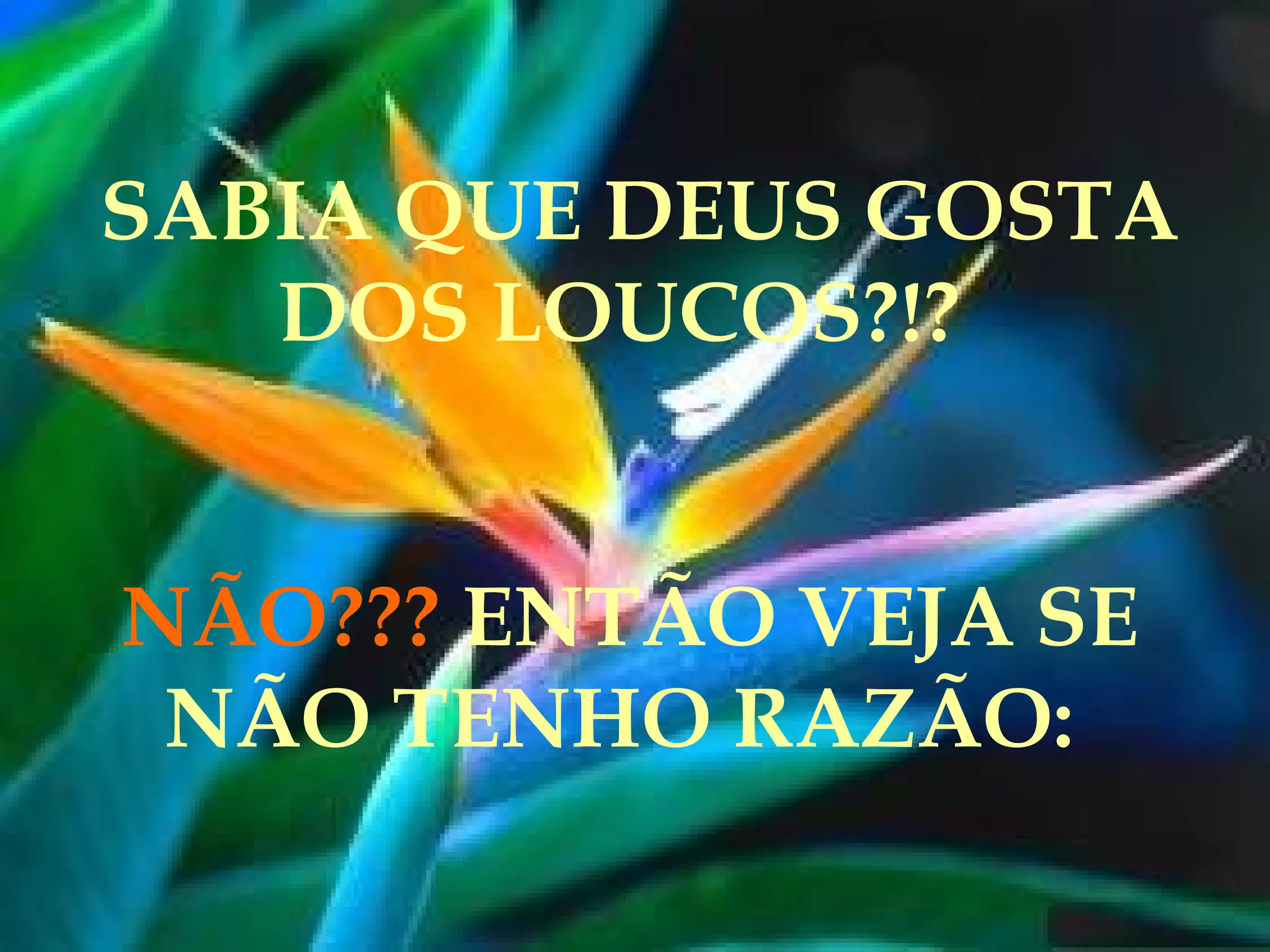 O documento incentiva as pessoas a terem fé e acreditarem no impossível, comparando exemplos bíblicos de pessoas que fizeram coisas "loucas" por fé, como Moisés dividindo o mar vermelho e Jesus ressuscitando mortos. Ele encoraja o leitor a "ficar doidão" e cometer loucuras por fé, sonhando e realizando o impossível com o apoio de Deus.