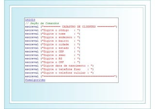1. Faça umalgoritmo para ler : nome, endereço, bairro,
