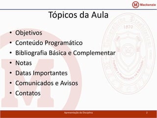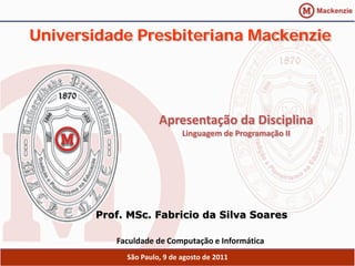 O documento apresenta a disciplina de Linguagem de Programação II ministrada pelo professor Fabricio da Silva Soares na Universidade Presbiteriana Mackenzie. Ele descreve os objetivos da disciplina, o conteúdo programático, a bibliografia, as datas importantes e as formas de contato com o professor.