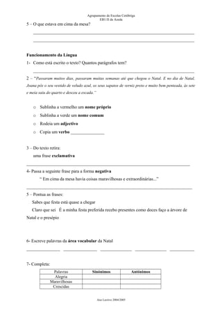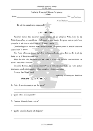 Este documento é uma avaliação trimestral de língua portuguesa para alunos do 1o período. Contém um texto sobre a ceia de Natal e questões sobre interpretação, funcionamento da língua e comunicação escrita.