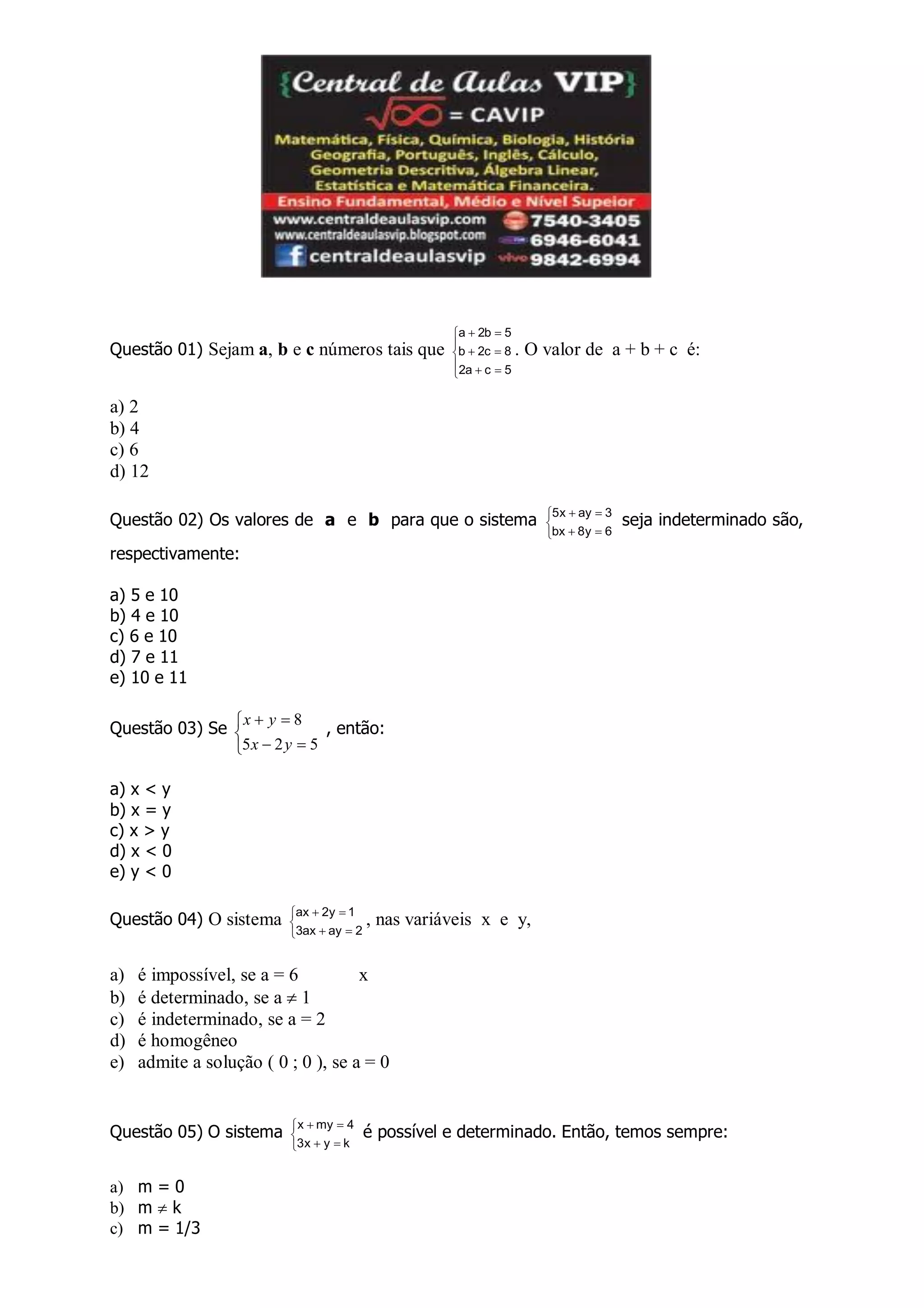 1) O documento contém 12 questões de múltipla escolha sobre sistemas de equações lineares e resolução de equações.