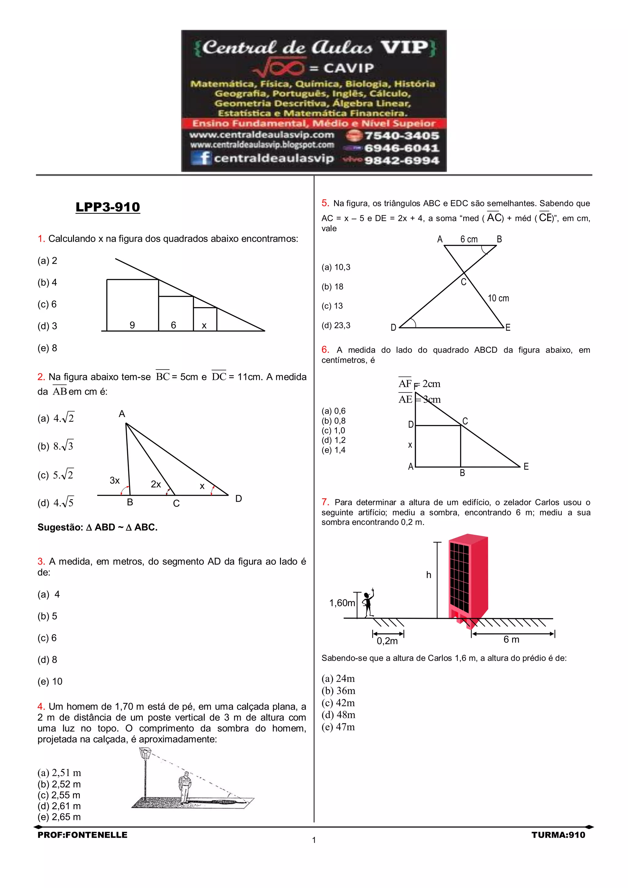 O documento apresenta 7 questões de matemática sobre geometria e proporcionalidade. As questões envolvem cálculos de medidas de segmentos, lados e alturas de figuras geométricas como triângulos, retângulos e prédios.