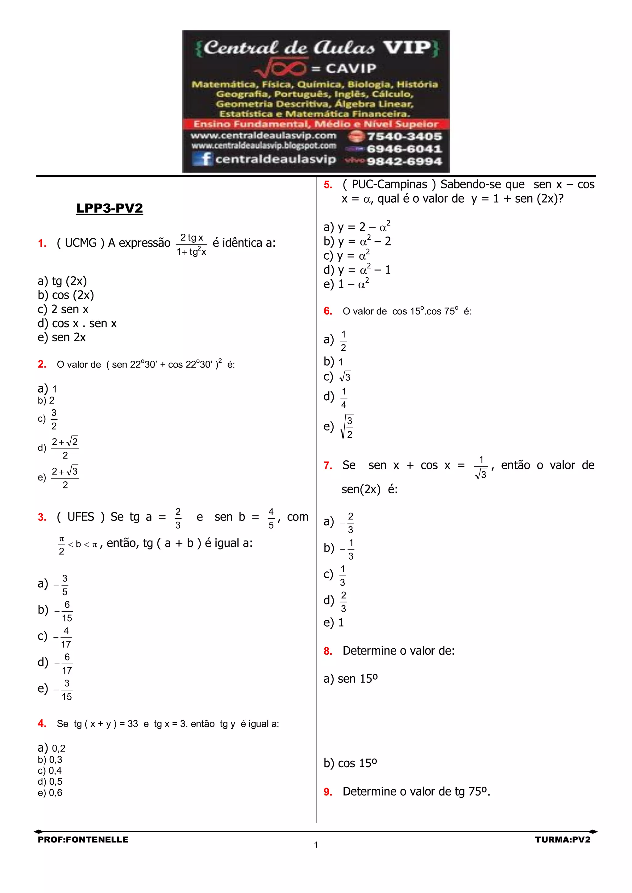 Este documento contém 10 questões sobre trigonometria. 1) A expressão dada é igual a sen 2x. 2) O valor da expressão dada é 2/3. 3) Se tg a = 3/2 e sen b = 5/4, com π/2 > b > π/4, então tg (a + b) é igual a 15/6 - .
