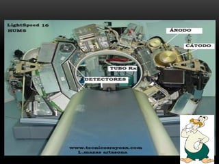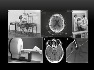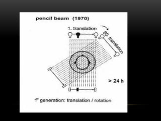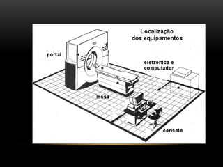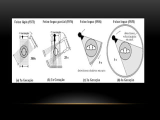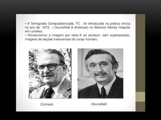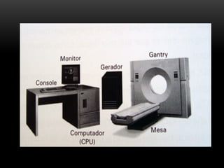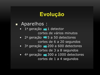 A tomografia computadorizada (TC) é um procedimento de raios X que obtém imagens transversais do corpo humano, utilizando um tomógrafo composto por um gantry, tubo de raios X e detectores. A tecnologia evoluiu ao longo das gerações desde a invenção por Sir Godfrey Hounsfield em 1972, com diversas melhorias na qualidade das imagens e tempo de corte. Existem diferentes tipos de TC, incluindo o feixe em leque e o cone beam, cada um com aplicações específicas, como na odontologia.