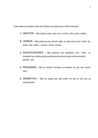 Este documento discute como aprender um idioma de forma efetiva. Ele explica que línguas podem ser aprendidas e divididas em partes como objetos, verbos, qualificadores, pronomes e gramática. O documento fornece exemplos destas partes da língua e estruturas chamadas "frames" para praticar substituições gramaticais.