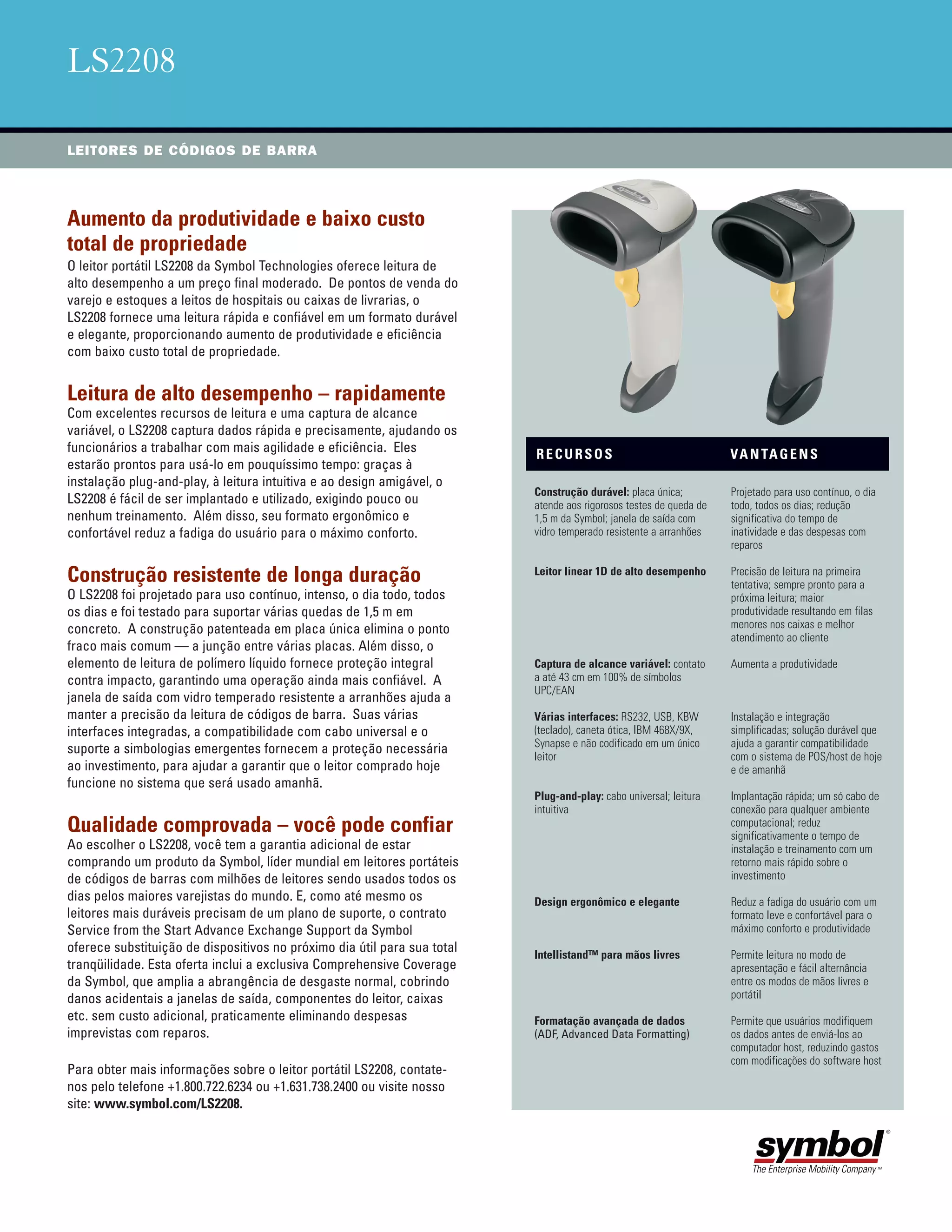O documento descreve um leitor de código de barras portátil da Symbol Technologies chamado LS2208. Ele fornece leitura rápida e confiável de códigos de barras a um baixo custo total de propriedade, aumentando a produtividade. O leitor é durável, resiste a quedas e possui várias interfaces para fácil integração.