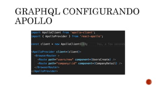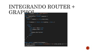 Este documento apresenta uma palestra sobre React Router, GraphQL e como integrá-los. O palestrante é um desenvolvedor frontend experiente que irá discutir o que são React Router e GraphQL, como o React Router gerencia URLs em aplicativos React e como GraphQL permite consultas personalizadas de APIs.