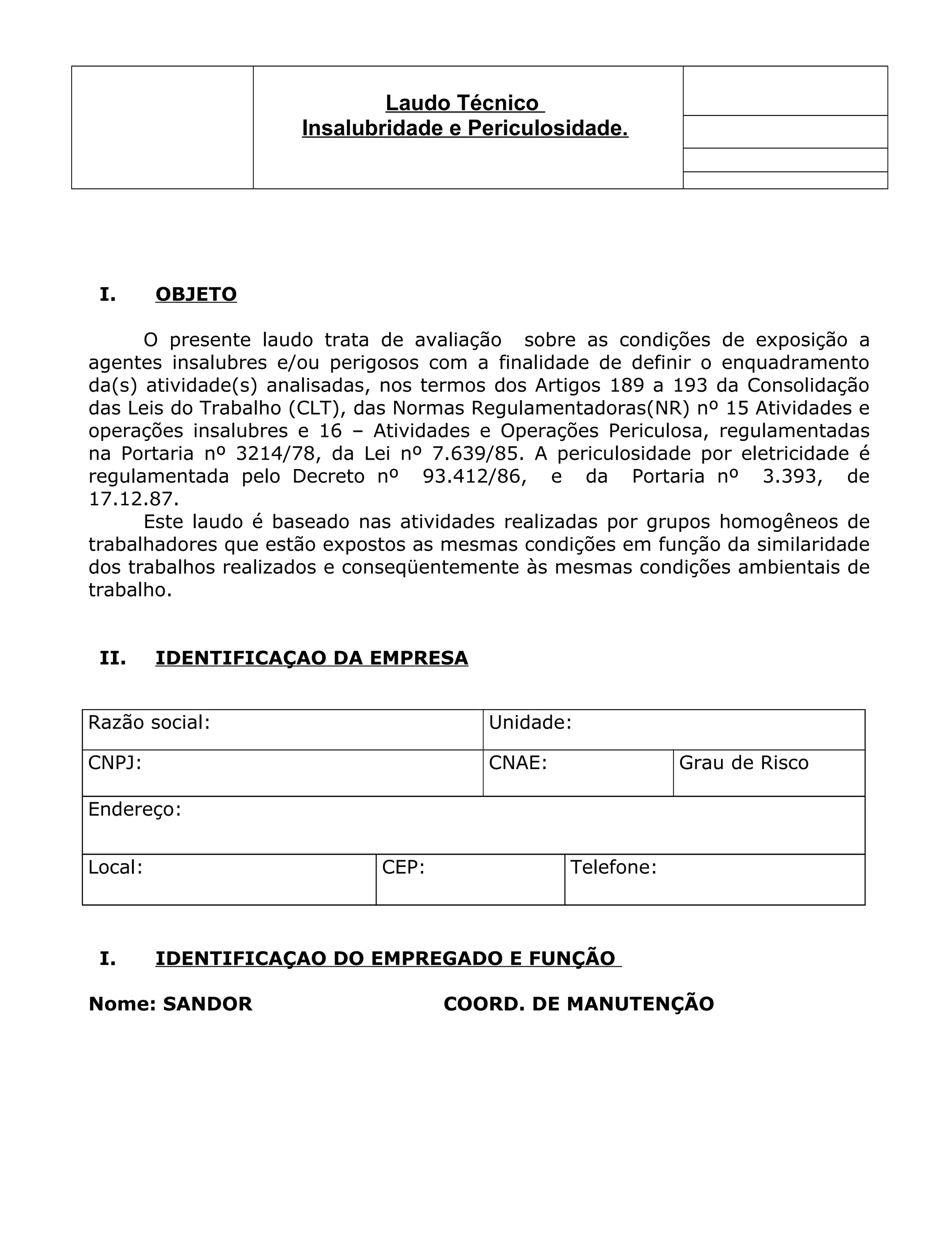 Este laudo técnico avalia as condições de trabalho de um coordenador de manutenção elétrica em usinas e conclui que ele está exposto de forma habitual a agentes perigosos por eletricidade, conforme a legislação brasileira. O laudo descreve as atividades realizadas, agentes de exposição como ruído e eletricidade, equipamentos de proteção fornecidos e enquadramento legal.