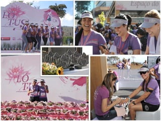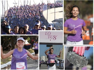 O documento descreve o Circuito Lótus, um evento de corrida feminino que ocorre em 4 cidades brasileiras e reúne mais de 15 mil mulheres. O texto destaca os benefícios do esporte para as participantes e a promoção da marca dos patrocinadores através do kit das atletas, arena do evento e mídia. Uma pesquisa aponta que 90% das corredoras ficaram satisfeitas com as provas no Circuito Lótus em 2011.