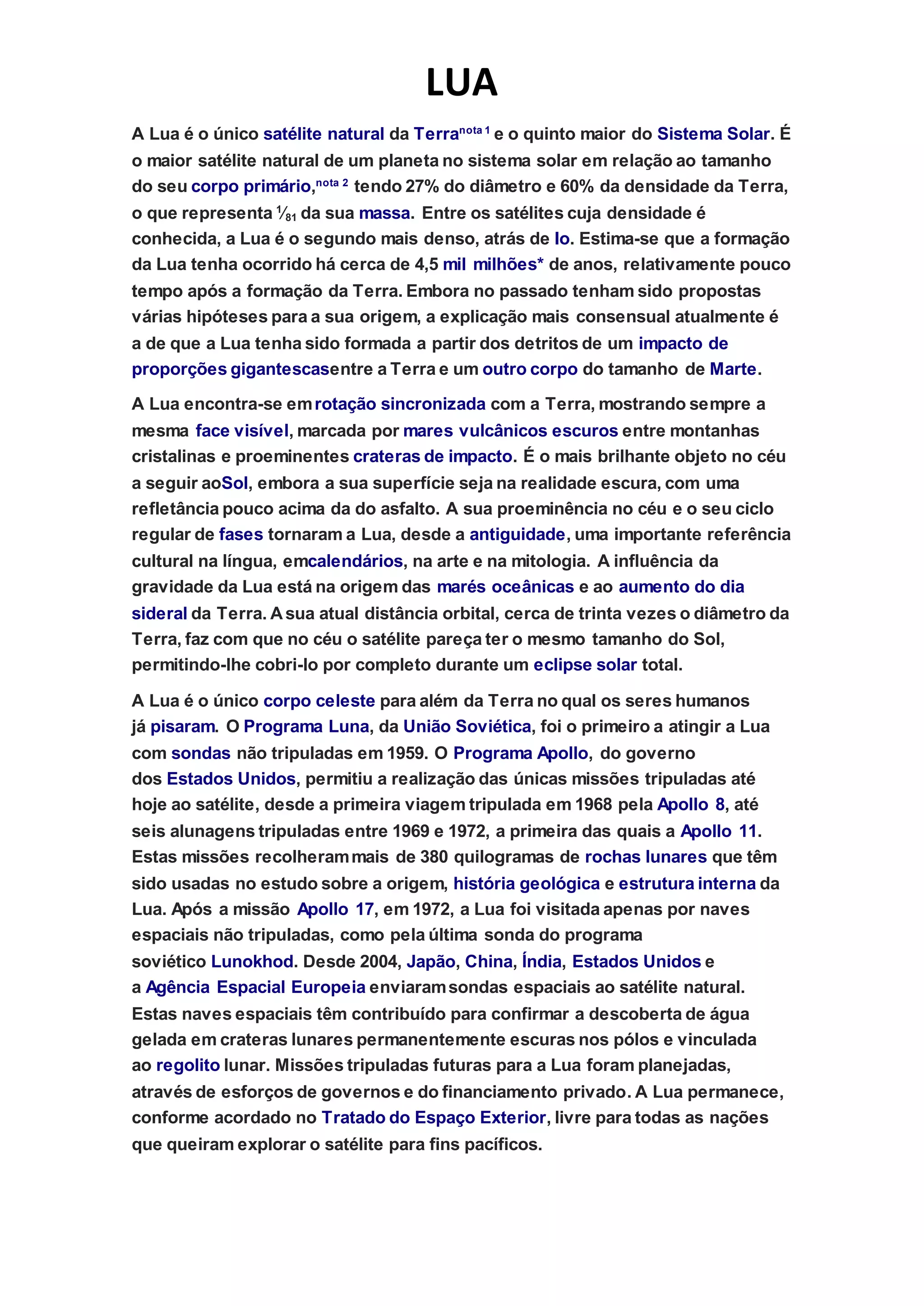 A Lua é o único satélite natural da Terra e o quinto maior do Sistema Solar. Sua formação ocorreu há cerca de 4,5 bilhões de anos como resultado de um grande impacto. A Lua é visível na Terra e teve grande influência cultural ao longo da história, além de causar as marés. Já foi visitada por missões tripuladas e não tripuladas de vários países.