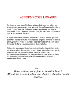 O documento descreve as principais formações geológicas observadas na superfície lunar, como mares (áreas escuras formadas por fluxos de lava), crateras (de impacto e vulcânicas), dorsas (cristas), montanhas e vales. Ele também menciona depósitos escuros resultantes de erupções vulcânicas explosivas.